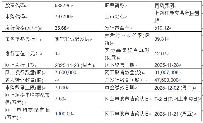 百奥赛图(北京)医药科技有限公司 截至招股说明书签署日,沉月雷、倪健直接或间接控制本公司及百奥赛图共同控股股东、实际控制人 26.8665%的表决权。沉月蕾和倪健是情侣。百奥赛图2025年11月20日披露的首次公开发行股票并在科创板上市招股书显示,公司拟募集资金118,504万元,用于前期研发平台建设项目、抗体研发项目及评价项目、临床前研发项目、医药追加工作等。 2025年11月27日百奥赛图首次公开发行股票并在科创板挂牌发布显示,按发行价格26.68元/股、新股发行数量4,750万股计算,若本次发行成功,预计募集资金总额为12.673亿元。扣除发行费用约12,295.46万元(不含税)后,预计募集资金净额为114,434.54万元。