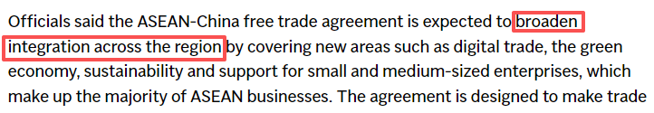 10月28日,中国-东盟自贸区3.0版本升级协议在马来西亚吉隆坡签署。 3.0版本升级协议共涵盖数字经济、绿色经济、供应链互联等9个领域。议定书的签署引起了国际舆论的广泛关注。不少媒体认为,中国-东盟自贸区3.0升级协议对于帮助实现经济经济一体化、增强产业链供应链稳定性具有重要作用。 “锦上添花” 美联社报道认为,中国-东盟自贸区升级协议3.0的签署,是区域贸易蓬勃发展的“锦上添花”。美联社(AP)网站报道截图援引东盟官员的话称中国-东盟自由贸易区3.0版预计将通过数字贸易、绿色经济以及对中小企业(占东盟企业的大多数)的持续支持来扩大该地区的一体化。该协议旨在扩大贸易优惠制度,改善小企业的市场准入,简化非关税程序并减少监管壁垒。美联社(AP)网站报道还援引分析师的话说,中国和东盟都可以从升级后的自由贸易协定中受益,特别是在供应链和可持续发展领域。 “承载邦马互利”亚洲新闻频道报道称,中国与东盟签署的自贸区3.0升级协议旨在构建长期经济韧性,加强经济一体化。亚洲新闻频道(CNA)网站报道截图援引新加坡总理黄循财的话说,协议的实施将为整个地区带来新的经济机遇。他强调:“只要东盟和中国继续重新努力合作,我们就能够继续促进本地区可持续和包容性增长,为各方带来长期利益。”新加坡贸工部发表声明称,中国-东盟自贸区3.0版为企业探索数字经济、绿色经济、供应链互联互通等新兴领域提供了新机遇。 “双赢” 半岛电视台报道认为,随着中国与东盟贸易持续增长,中国—东盟自贸区升级恰逢其时。半岛电视台网站报道截图报道称,中国与东盟虽然互为最大的贸易伙伴,但贸易规模的不断增长很大程度上反映了东盟生产链和供应链一体化的趋势日益增强。他地区。报道认为,中国-东盟自贸区3.0升级协议的签署正值双方都希望进一步加强双边关系,并取得“双赢的结果”。编译、图文:杉杉